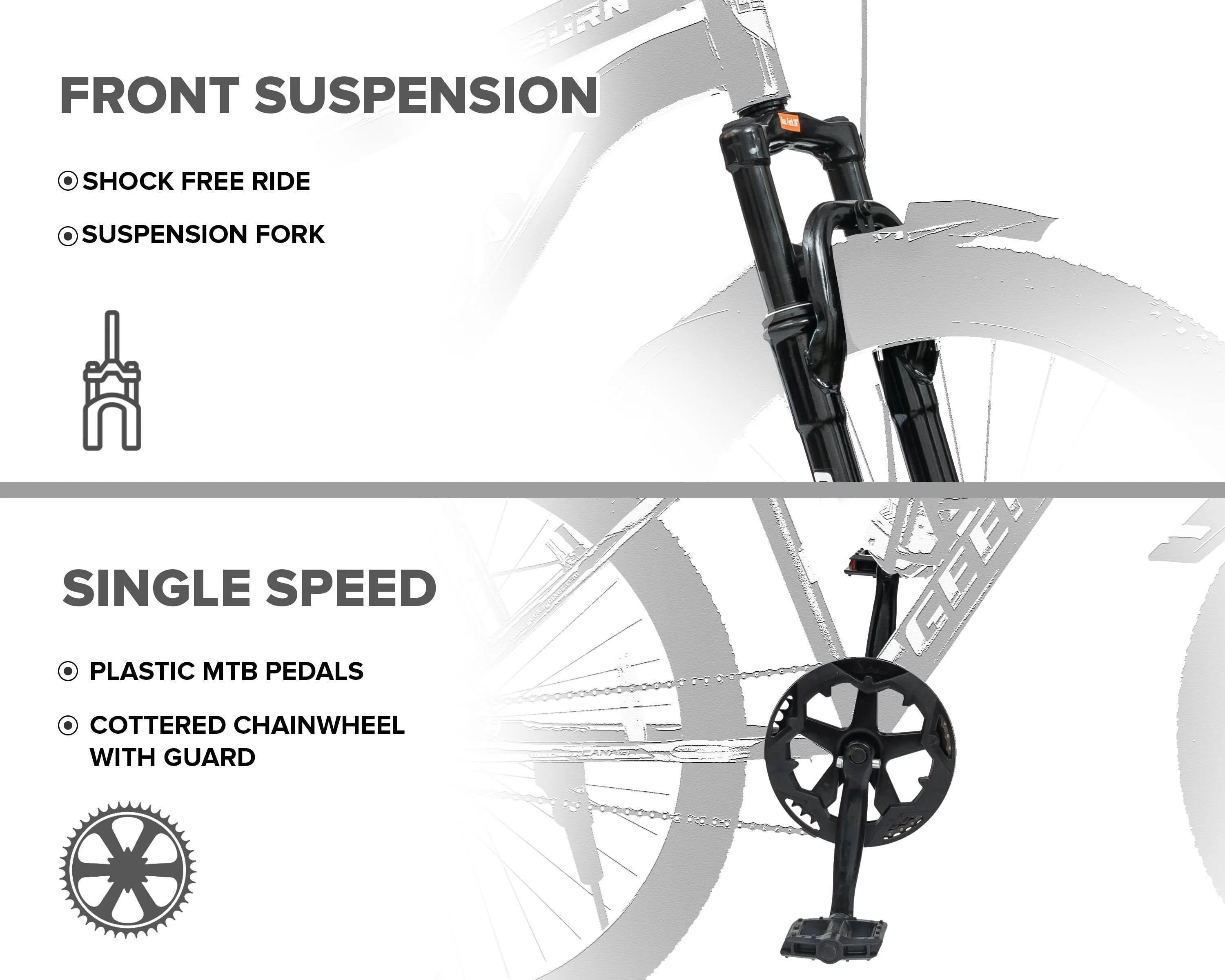 Hi quality single speed MTB cycle with Laser decals and unmatched comfort. High quality components, superior brakes and includes mudguards.